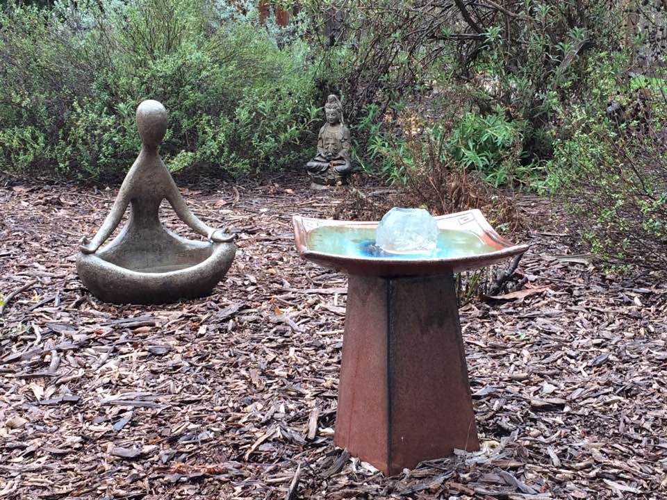 We have lived on this beautiful little patch of ground for over 20 years now, and I think perhaps I can sometimes get a sense of what the spirit of the land is saying. Right now it is saying Hallelujah! and who am I to argue? I even went out in the rain to take a picture of our outdoor chalice, now full of water, and the gratitude of a couple of our garden statues, and I survived the journey (left my glasses in the house though, let’s not push our luck)!